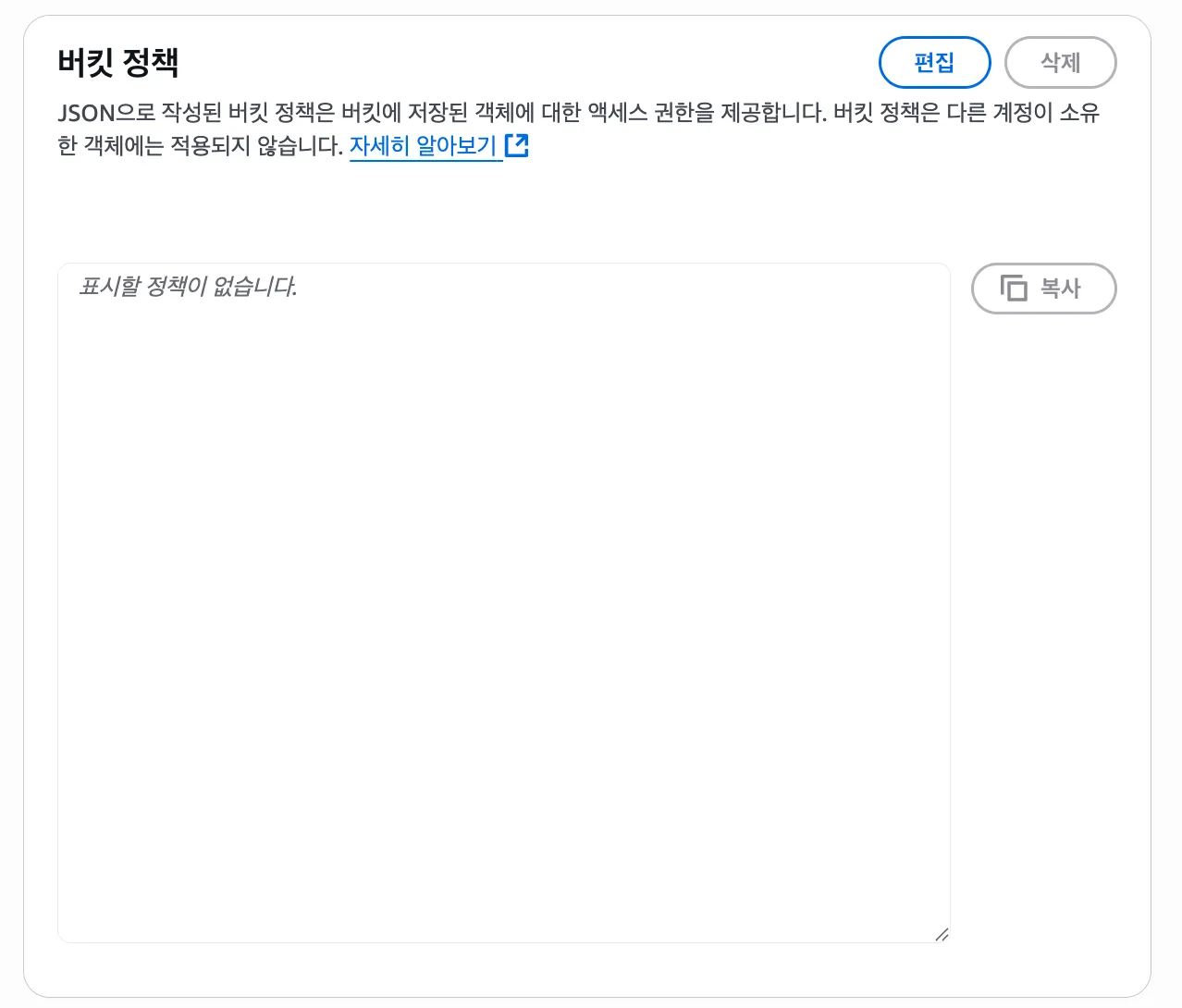 그러면 우리가 아까 이론을 공부했던 버킷 정책을 편집할 수 있는 칸이 나오게 되는데 편집을 눌러서 버킷 정책을 편집해보자.