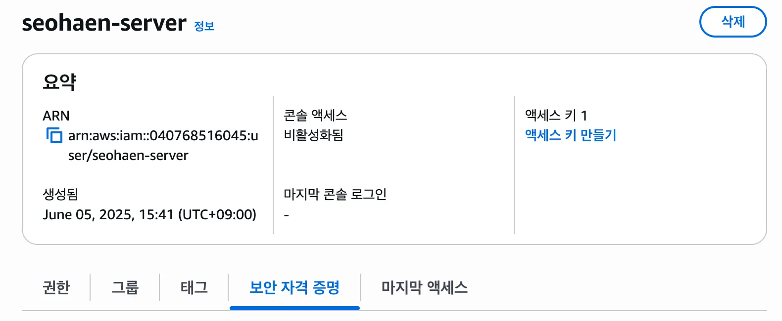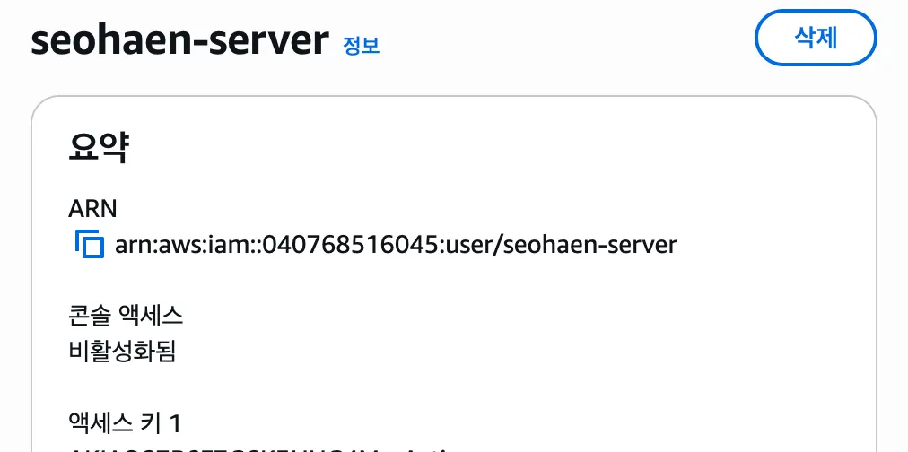 액세스 키 발급 완료 (현재 S3 삭제하여 노출되어도 괜찮다.)
