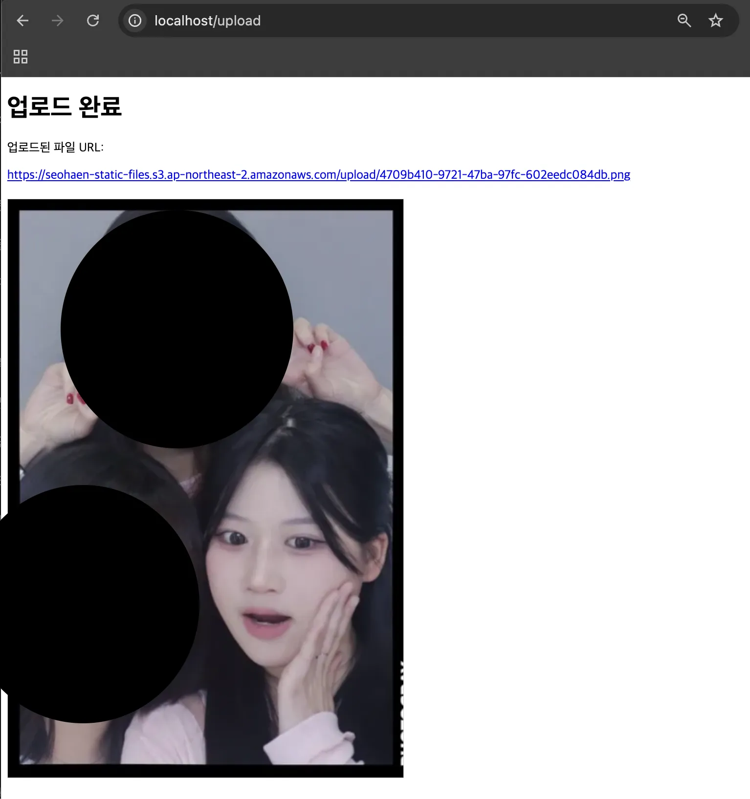 localhost/upload로 이동하며 S3에 저장된 이미지의 url과, 해당 이미지의 사진이 성공적으로 도출되는걸 확인할 수 있었다.