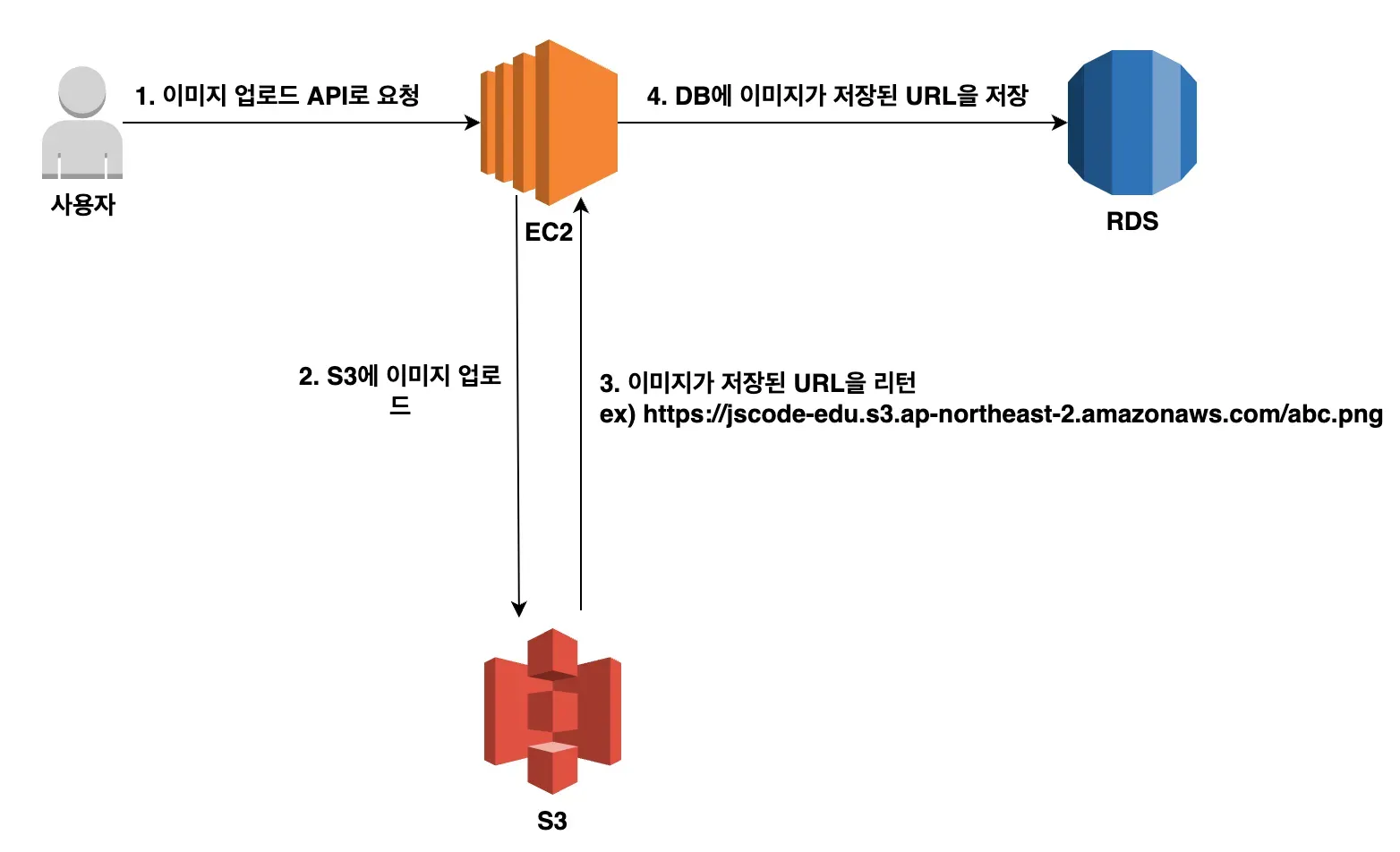 사용자가 이미지혹은 파일을 업로드하는 API 요청을 EC2서버에 보내면 EC2는 S3에 이미지를 업로드하게 된다.