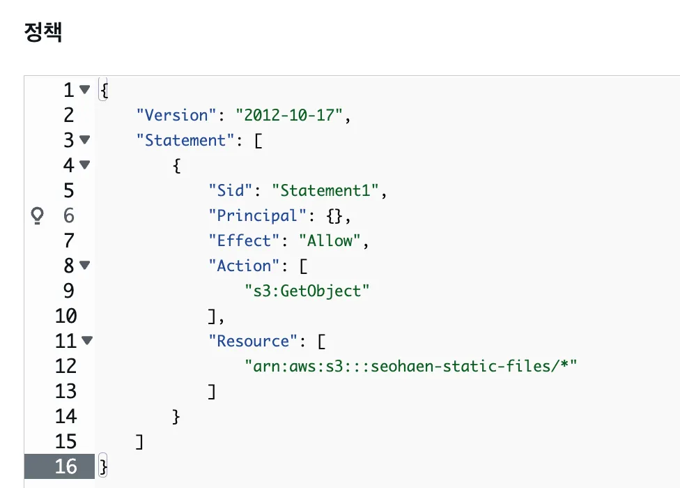 위와같이 입력하면 AWS S3에 여러 리소스들이 있는데, 거기에 있는 seohaen-static-files 버킷에 있는 모든 객체에 대해서 리소스의 대상을 정할 것이다. 라는 뜻이다.