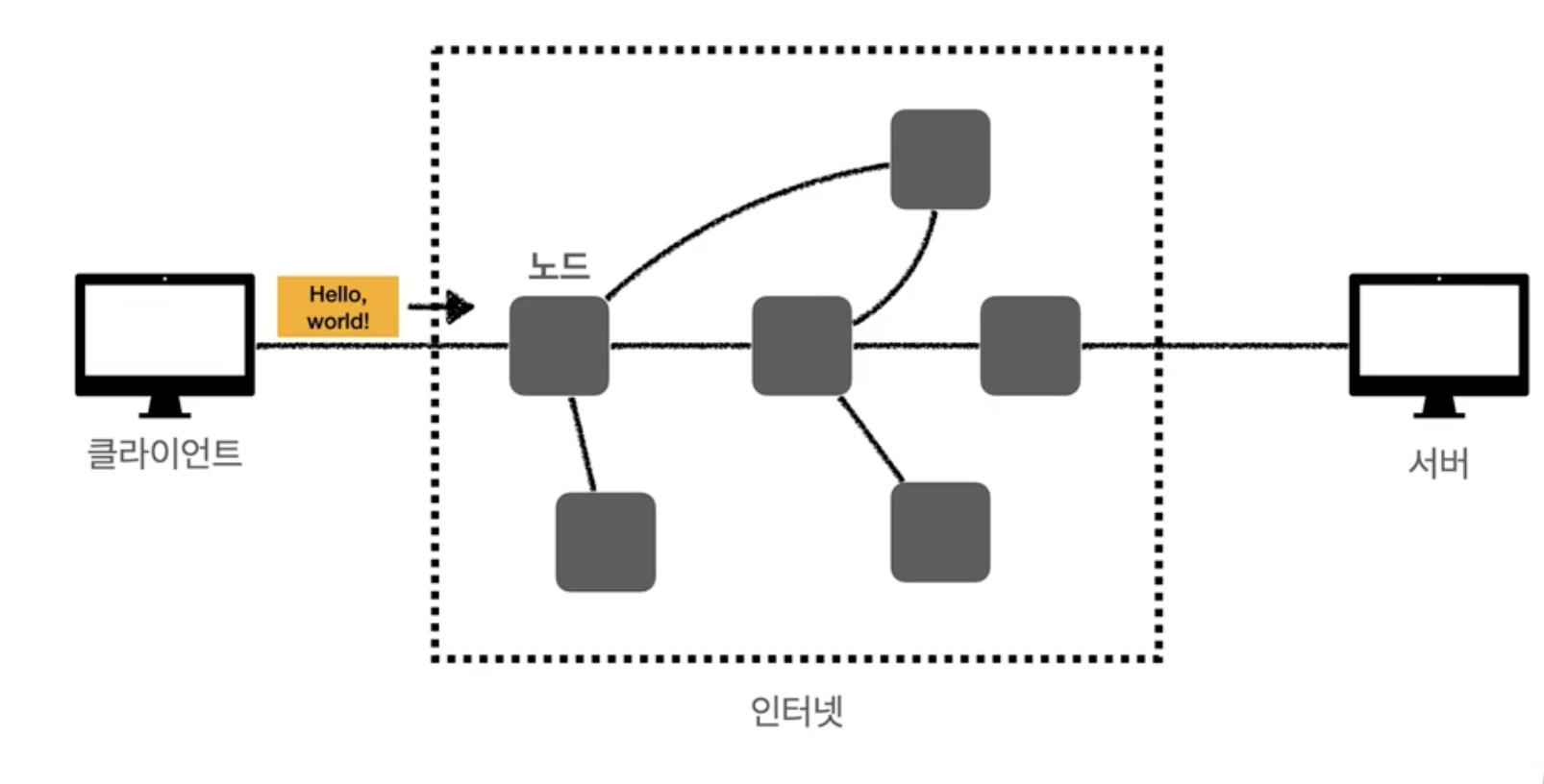 하지만 인터넷은 단순하지 않아 수 많은 중간 노드라고 하는 서버를 거쳐서 메세지가 도착하게 된다.