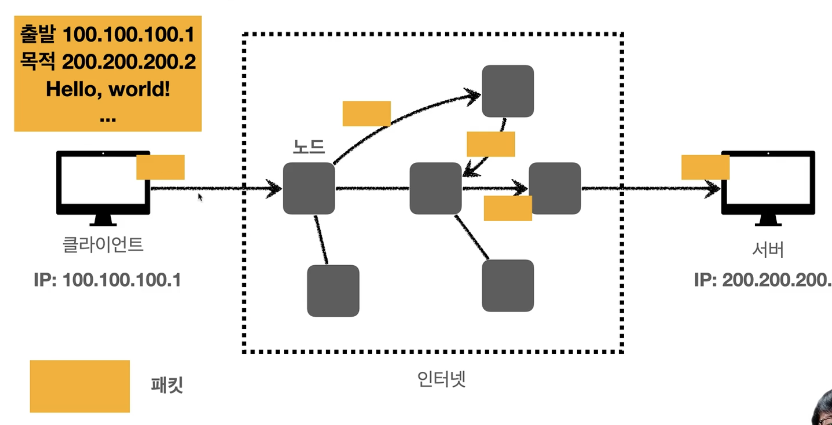 IP 프로토콜에 의해서 서버들이 규약을 따르고 있기때문에 (목적지IP, 출발지IP 등)다 이해를 하며 노드끼리 던진다.