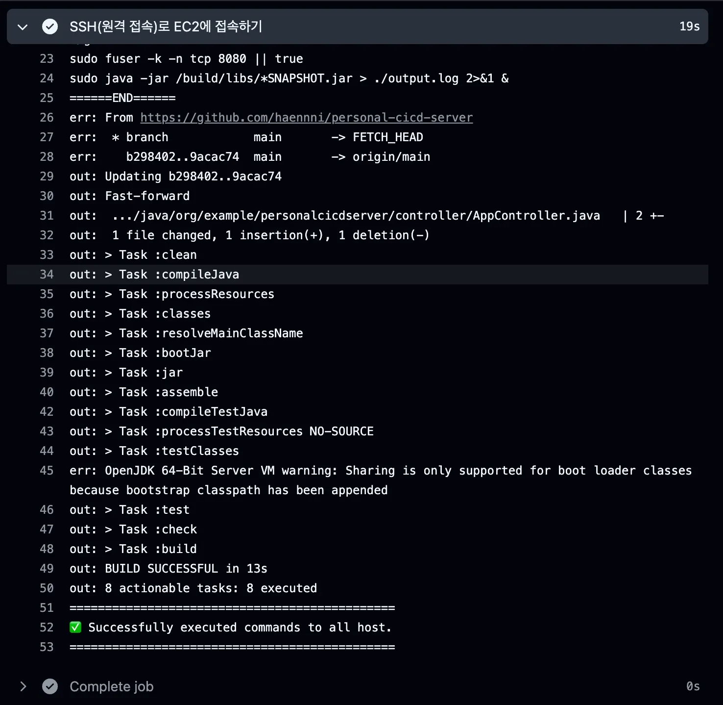 여기서 필자는 nohup java -jar build/libs/*SNAPSHOT.jar > ./output.log 2>&1 & 부분을 EC2에서 직접 빌드할 때 처럼 nohup라는 명령어를 빼고 java -jar build/libs/*SNAPSHOT.jar > ./output.log 2>&1 &만 입력했다가 무수한 에러를 맛봤다... 잘 입력해주자.