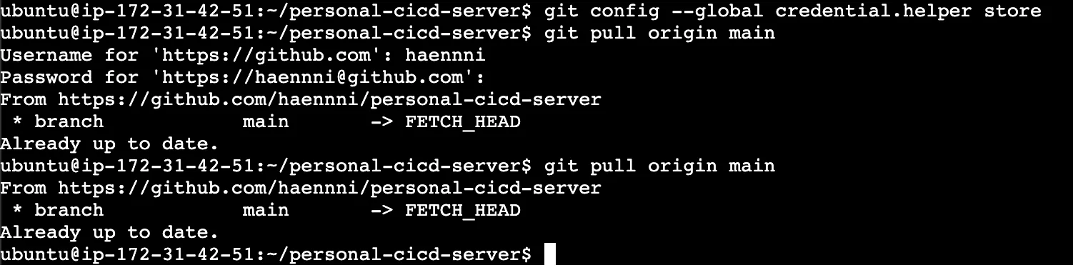 이 경우 EC2 서버에 .git-credentials 파일이 생성되어 깃허브 계정과 토큰이 평문으로 저장되는 보안상 취약점이 생길 수 있다.