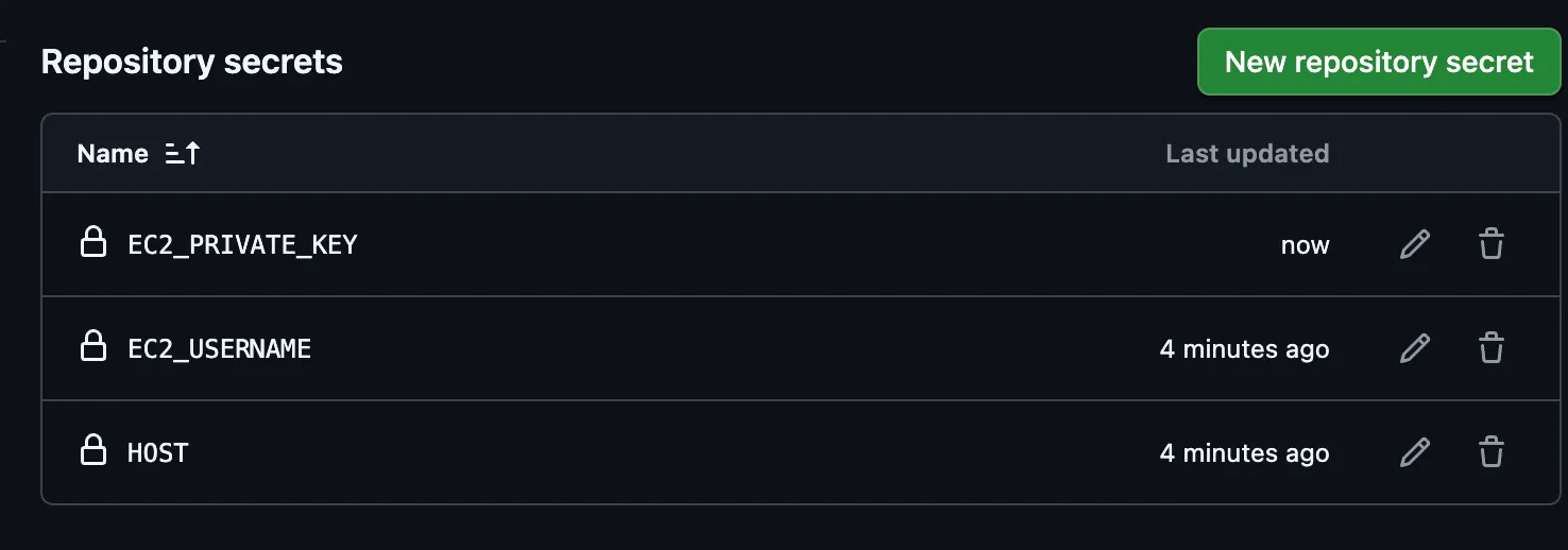 그 전에 EC2 IP, 키 페어등을 Secret 변수에 추가해주자.