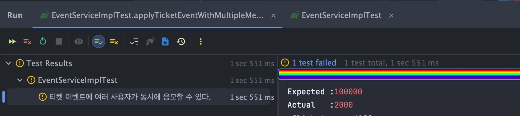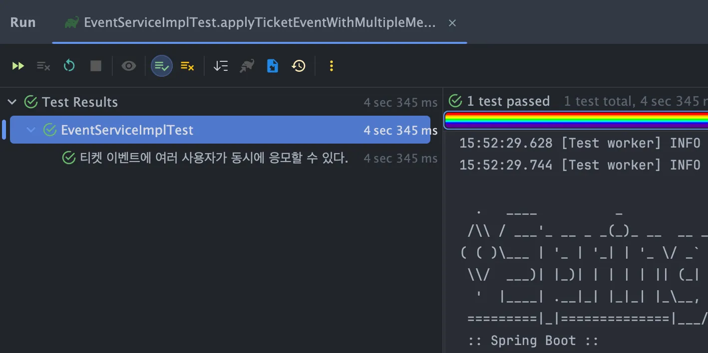 applyTicketEvent은 단순 반복 루프를 가지고 있는 메서드이기때문에 트랜잭션을 붙여주지않았고, applyTicketEventOnce에는 트랜잭션을 붙이고, 트랜잭션 전파도 설정해주었다.