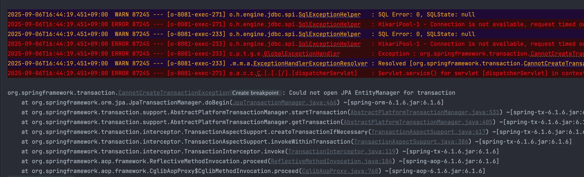 c.p.t.g.e.GlobalExceptionHandler : Exception : org.springframework.transaction.CannotCreateTransactionException: Could not open JPA EntityManager for transaction