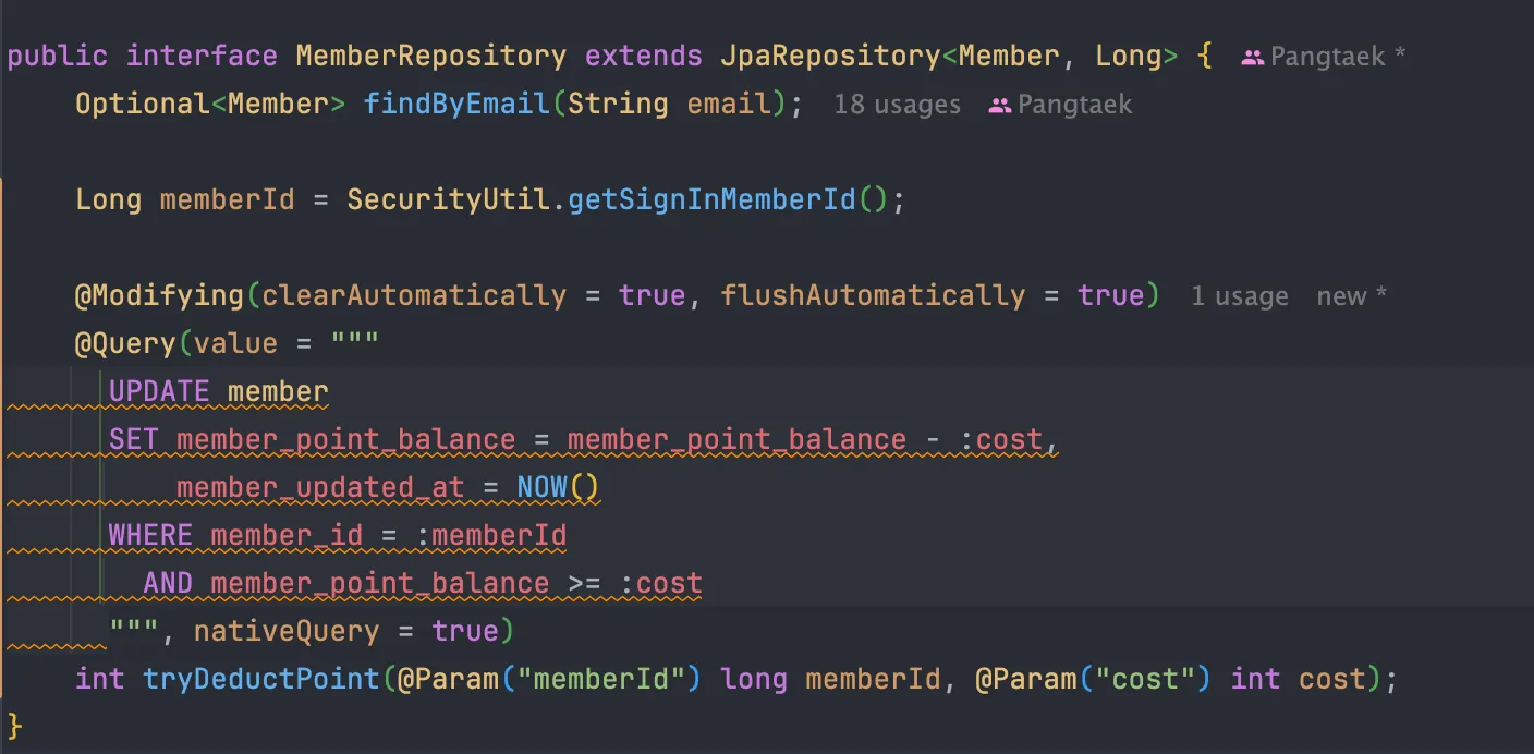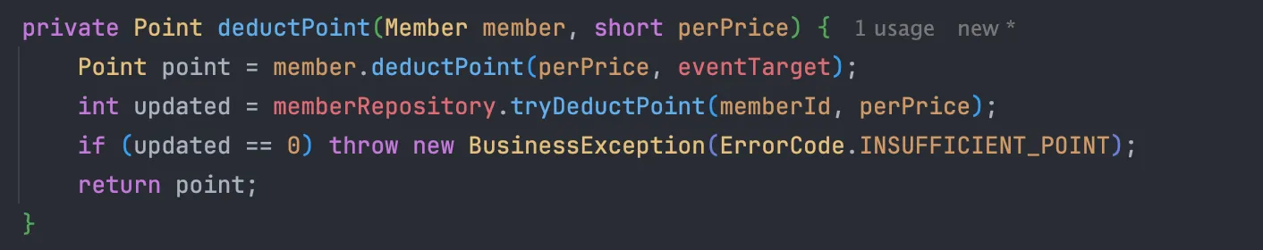 int updated = memberRepository.tryDeductPoint(memberId, perPrice);