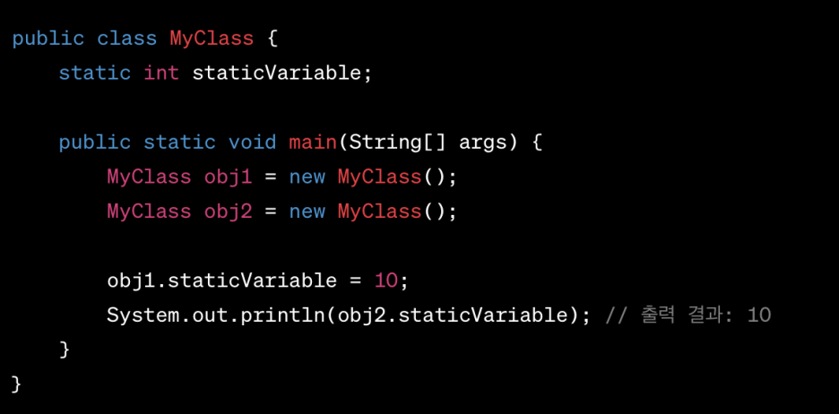 1. 정적 변수 (Static Variables): 클래스의 모든 인스턴스가 공유하는 변수입니다. 클래스의 모든 객체가 이 변수를 동일한 값으로 공유하게 됩니다.