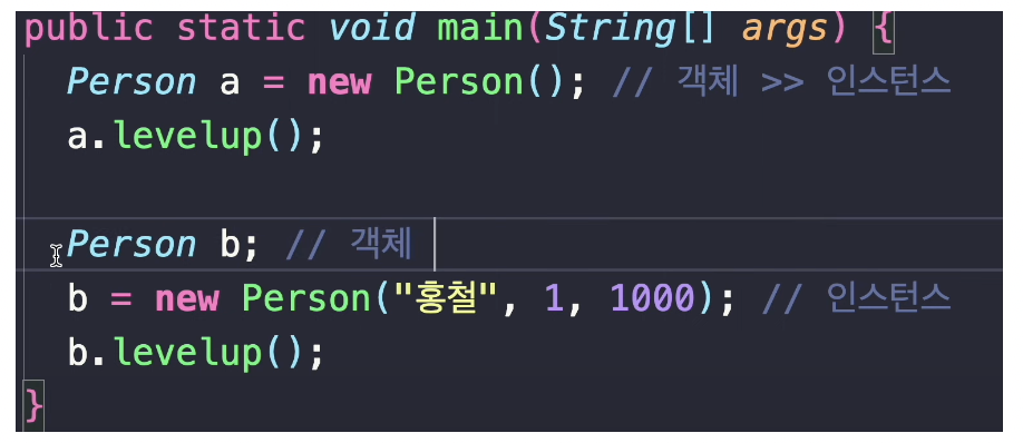 Person b; 처럼 클래스를 데이터 타입으로 둔 변수를 선언한 상태를 객체라고합니다.