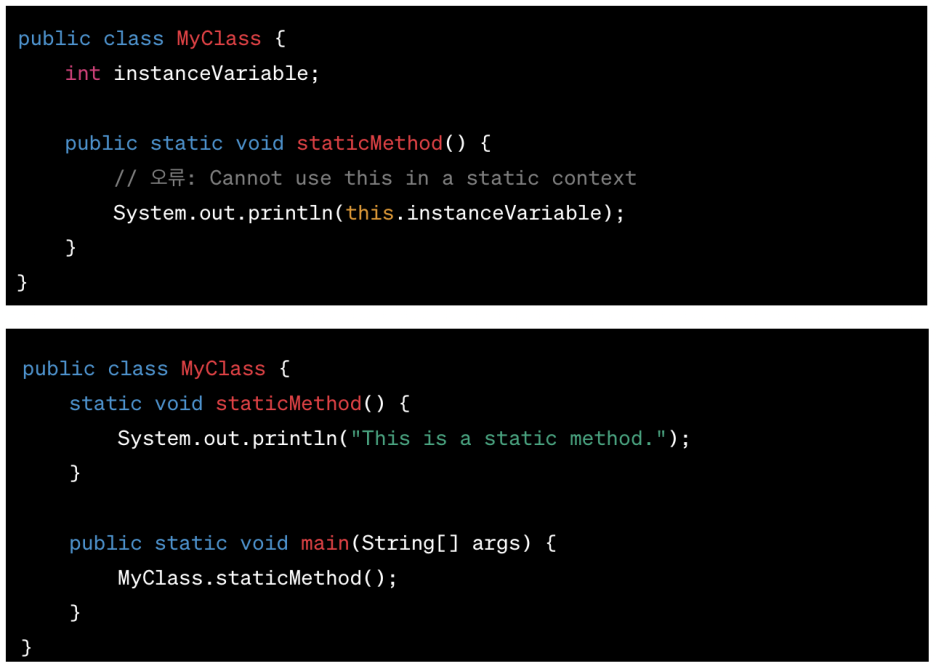 💡 네 맞습니다 ! 정적 메서드나 정적 변수는 인스턴스에 속하지 않기 때문에 this 키워드를 사용할 수 없습니다