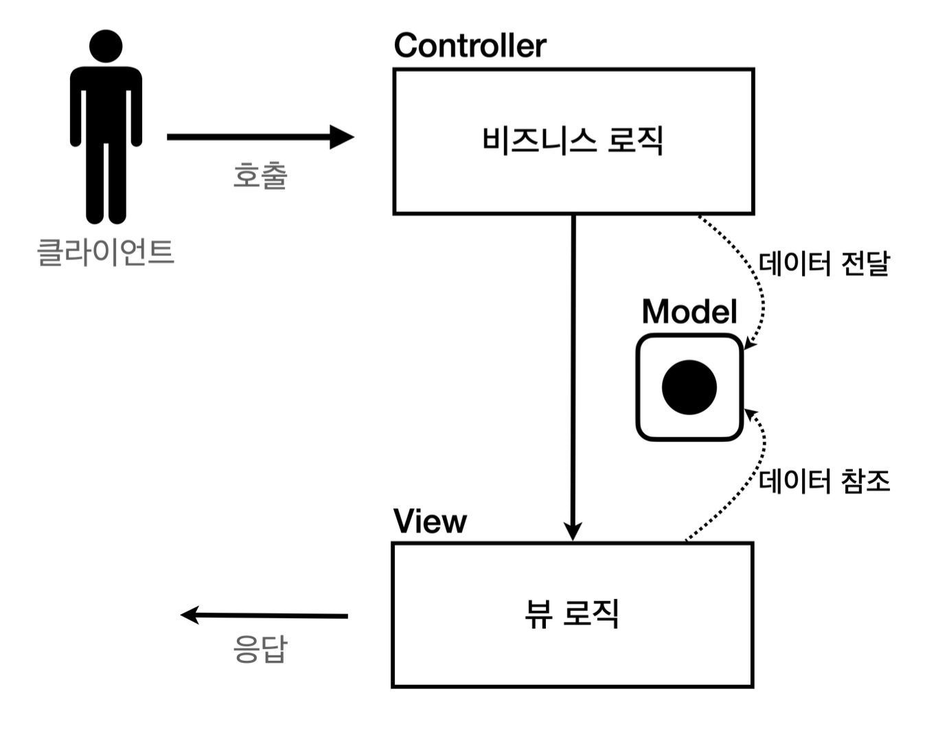ㅇ Controller(컨트롤러): HTTP 요청을 받아서 파라미터를 검증하고, 비즈니스 로직을 실행한다. 또, View(뷰)에 전달할 결과