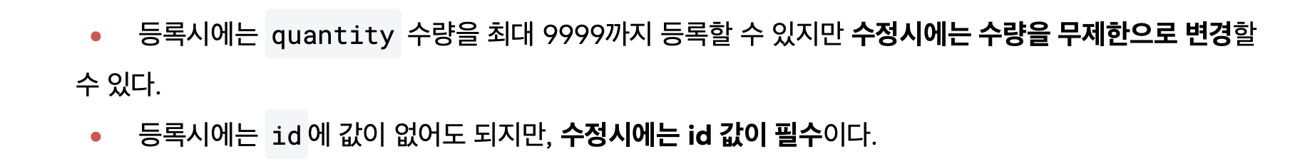 (등록 페이지에서는 수량이 9999까지 제한되지만, 수정 페이지에서는 수량 제한이 없음, 수정 시 id 값이 필수임)