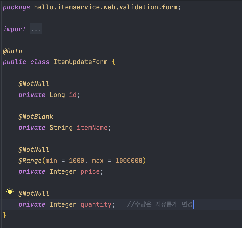 상품을 수정할 때, 요구사항 중 id는 Null값이면 안되며, itemName은 공백이거나 비어있으면 안되고, price값은 1,000원 이상이며 1,000,000원 이하여야하며, 수량은 저장할 때와 다르게 수량 제한이 없으므로 @NotNull만 넣어 검증 코드로 @NotBlank, @NotNull, @Range, @Max 등을 사용해주었다.