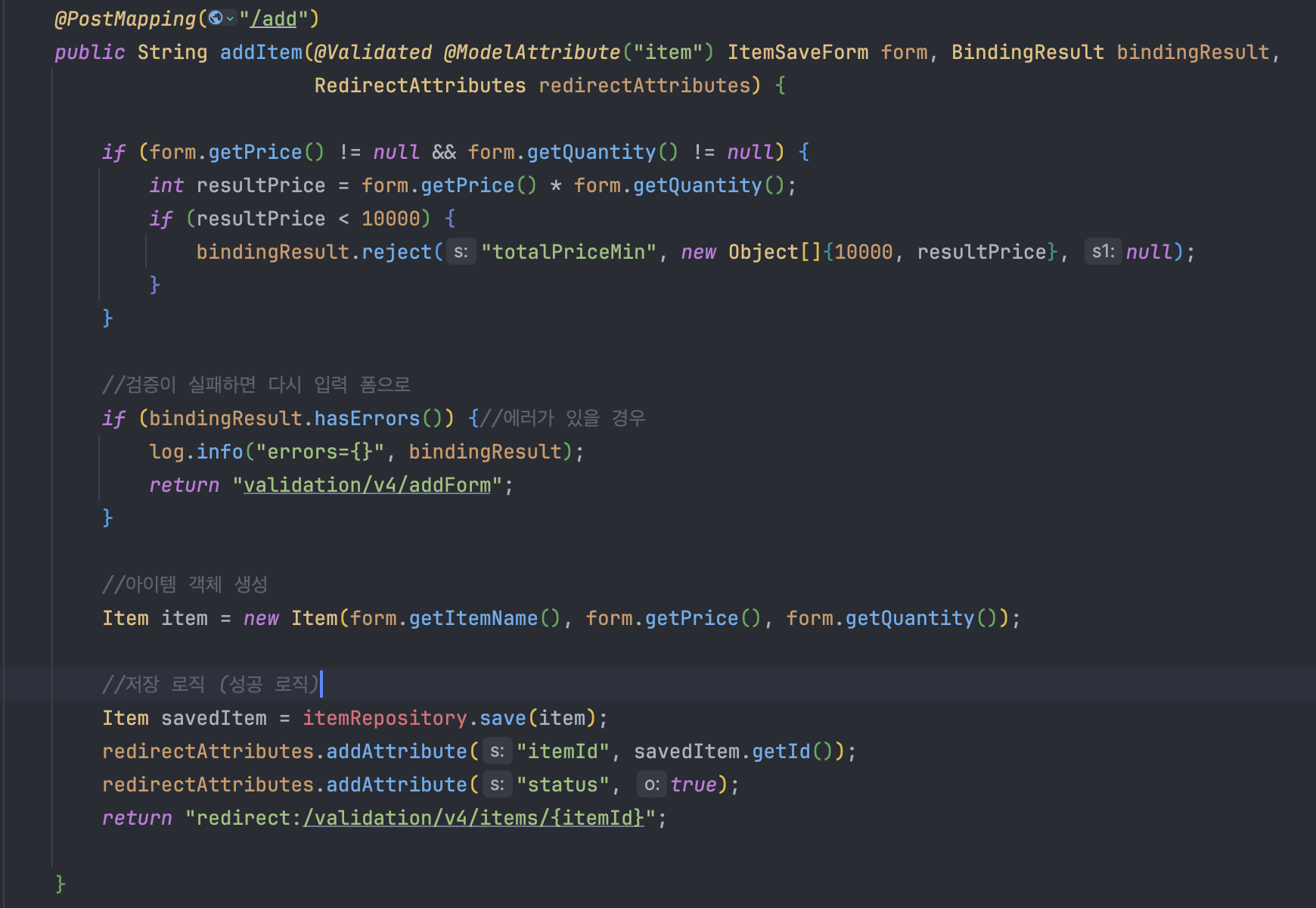 (주의!): addForm.html을 변경하고싶지 않으면, model의 이름을 ("item")이라고 지정해줄것.