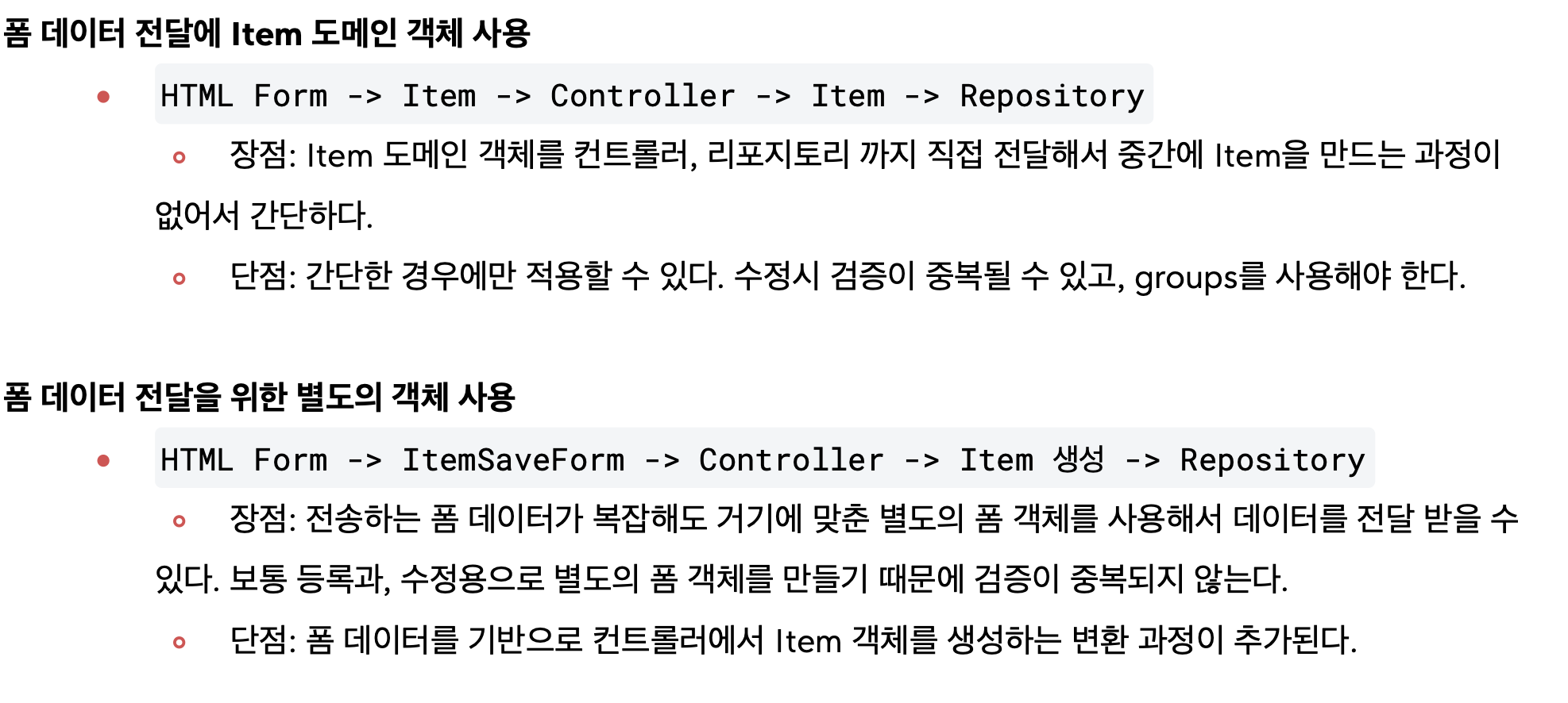 실무에서는 회원 등록시, 회원과 관련 된 데이터만 전달 받는 것이 아니라,약관정보도 추가로 받는 등 'Item'과 관계없는 수 많은 부가 데이터가 넘어온다. 그래서 보통 'Item' 을 직접 전달받는 것이 아니라, 복잡한 폼의 데이터를 컨트롤러까지 전달할 별도의 객체를 만들어서 전달한다.