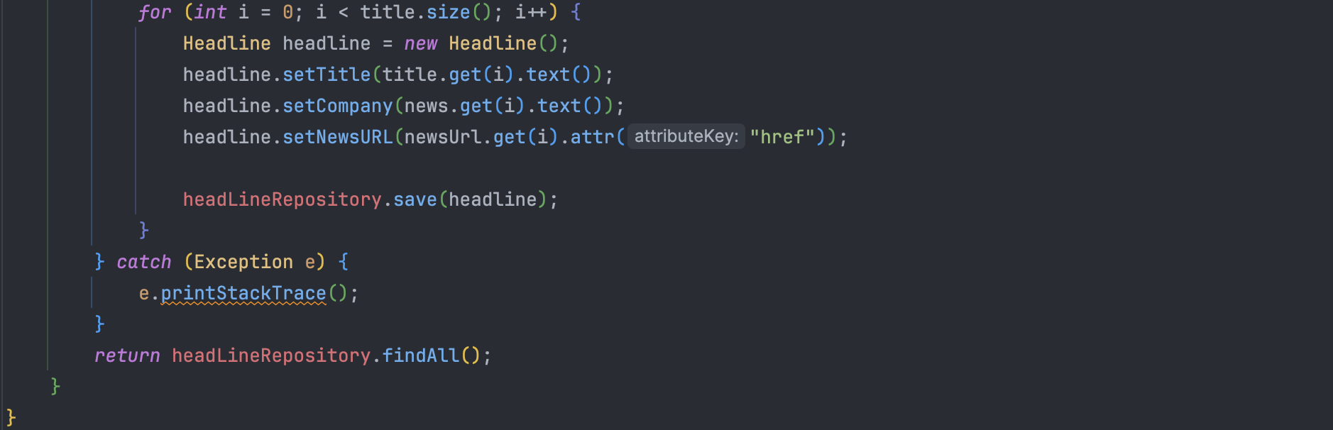 이후 for문을 돌려서 Headline 객체를 생성하고 title,company,newsURL의 값을 각각 set으로 값을 넣어준뒤 headLineRepository.save()를 통해서 db에 저장되도록 하였다!