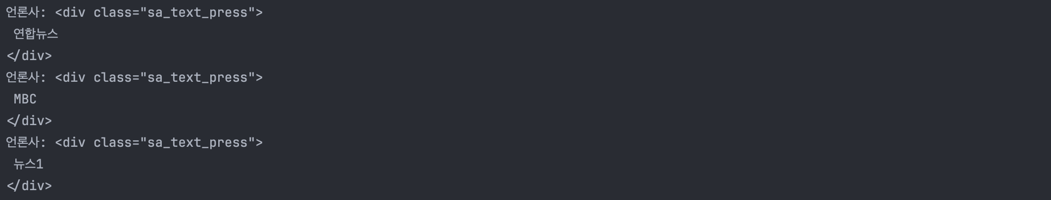 근데 헤드라인 뉴스제목과 같이 코드를 작성하니, 언론사 데이터만 추출하고싶은데 다른 코드까지 같이 뜨는 것을 확인할 수 있었다.