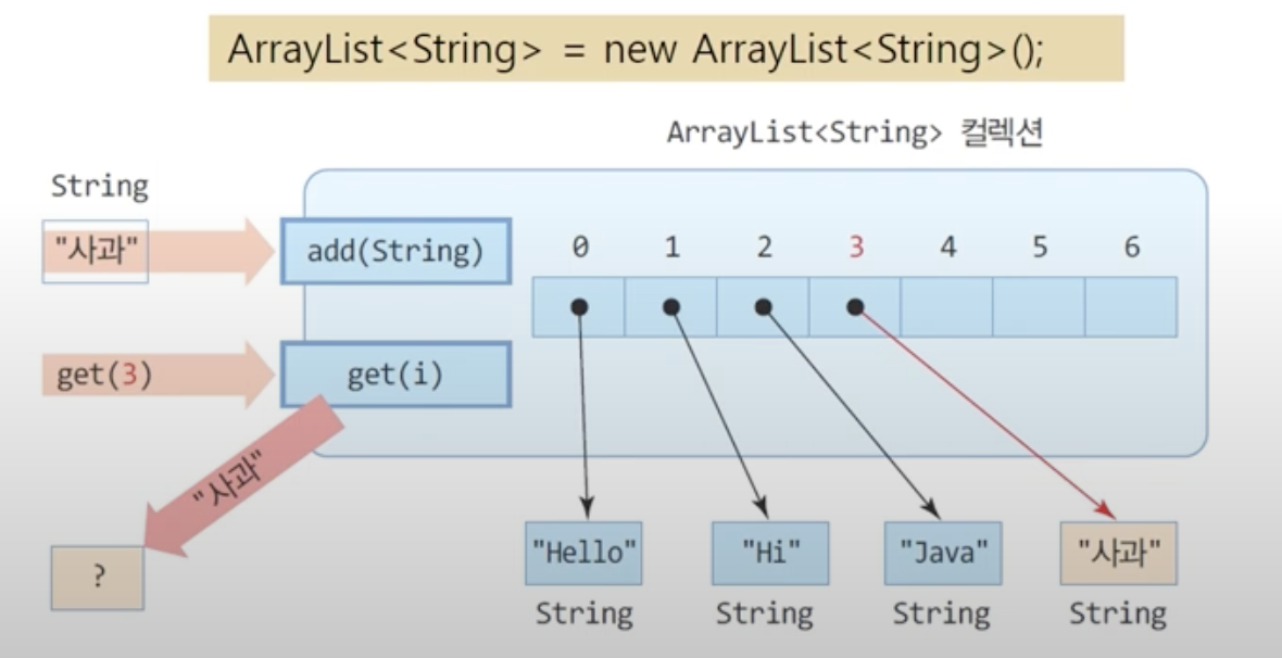 - 가변 크기 배열을 구현한 클래스: <E>에 요소로 사용할 특정 타입으로 구체화