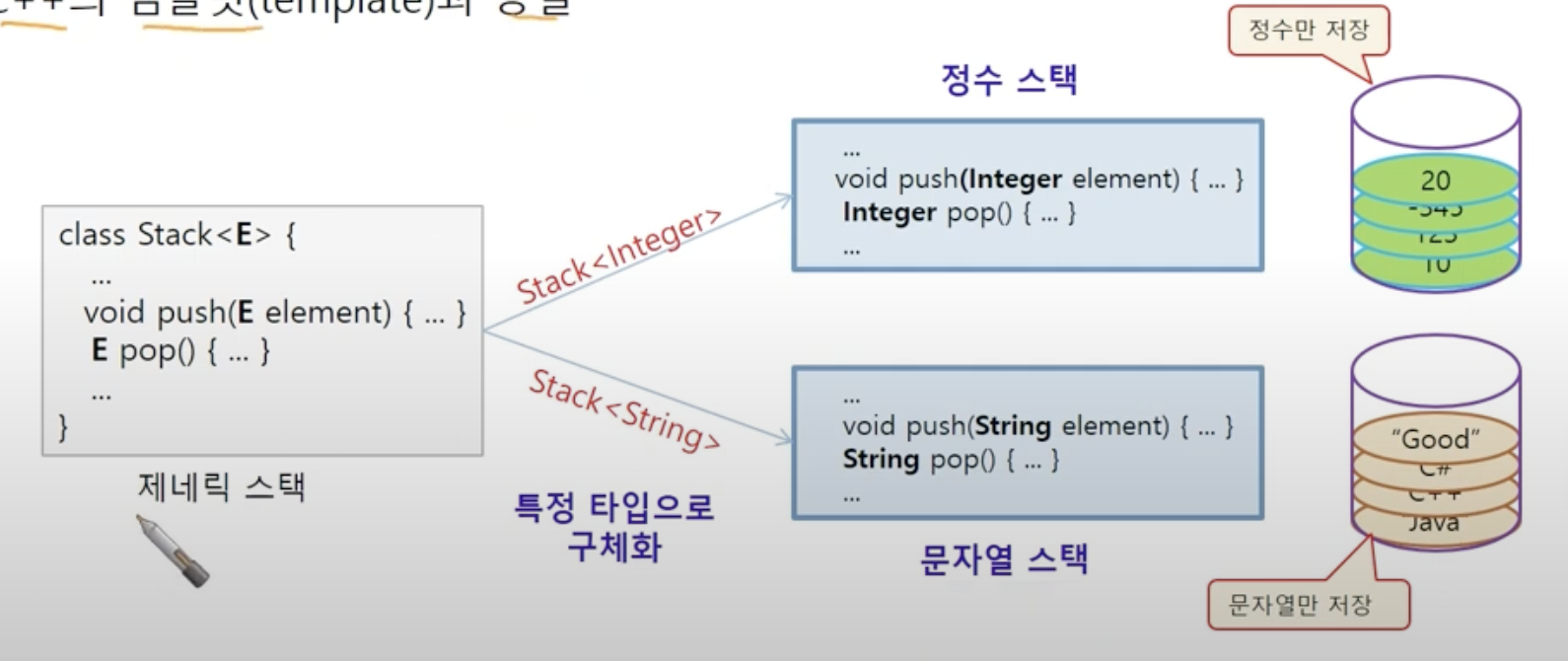 :특정 타입만 다루는 것이 아닌, 타입을 변환할 수 있도록 클래스나 메소드를 일반화하는 방법