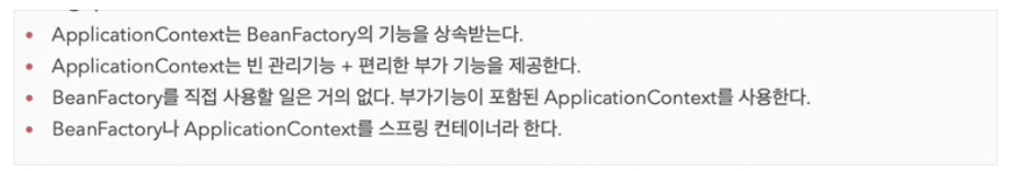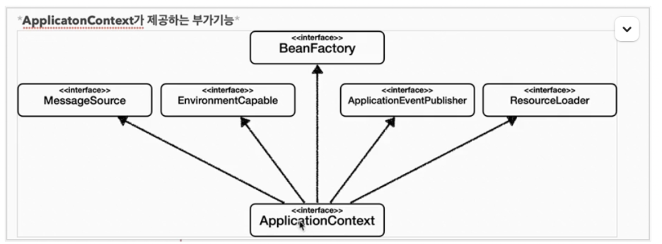 BeanFactory (최상위 인터페이스)를 ApplicationContext 인터페이스가 상속받음(BeanFactory 인터페이스에 부가기능을 더한 것)