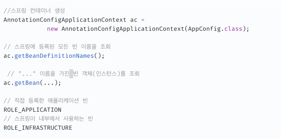 - 'ac.getBeanDefinitionNames()': 스프링에 등록된 모든 빈 이름 조회