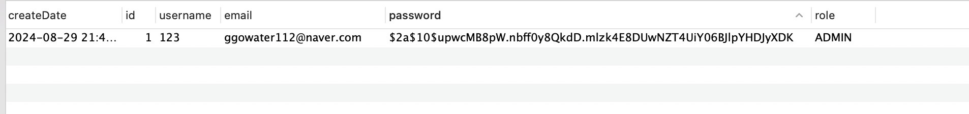 DB에 password가 암호화되어 잘 저장된 것을 볼 수 있었다~!