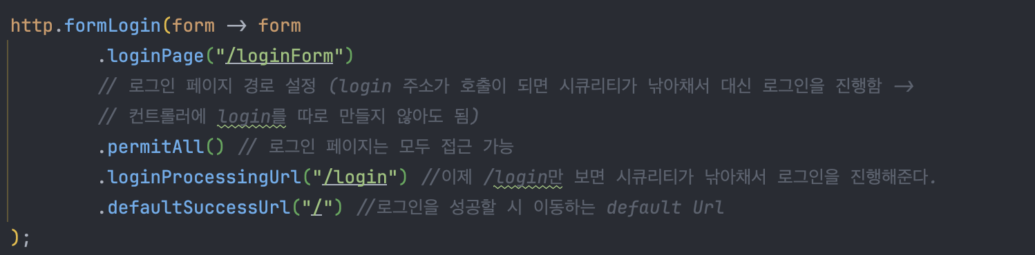 :로그인 페이지 경로를 '/login'으로 지정한다. 인증이 필요한 상황에서 로그인 페이지로 리다이렉트 된다. - permitAll()