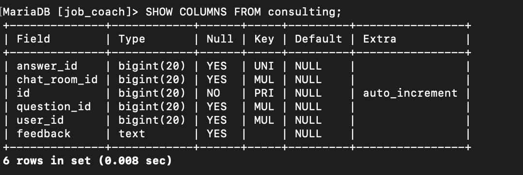 Consulting 테이블의 feedback 데이터 타입을 확인해보았다.