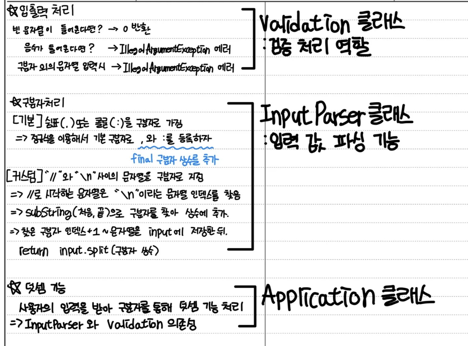 객체지향적으로 설계를 하고자하여 main클래스에서 코드를 다 작성하는 것이 아닌 역할별로 클래스를 나누어서 메인 클래스에서 의존성을 주입받아 결과를 반환하는 식으로 작성을 해보았는데요. 빈 문자열이 들어오면 0을 반환해주거나, 사용자가 입력을 잘못한 경우(음수를 입력하거나 구분자 외의 문자열을 입력했을 시) IllegalArgumentException 예외를 터트리는 검증 처리를 Validation 클래스에서, 기본 구분자로 파싱을 해주거나, 사용자가 커스텀구분자를 지정한 경우 커스텀 구분자를 구분자 상수에 등록하고 파싱을 해주는 기능을 InputParser클래스 에서 구현하였습니다.