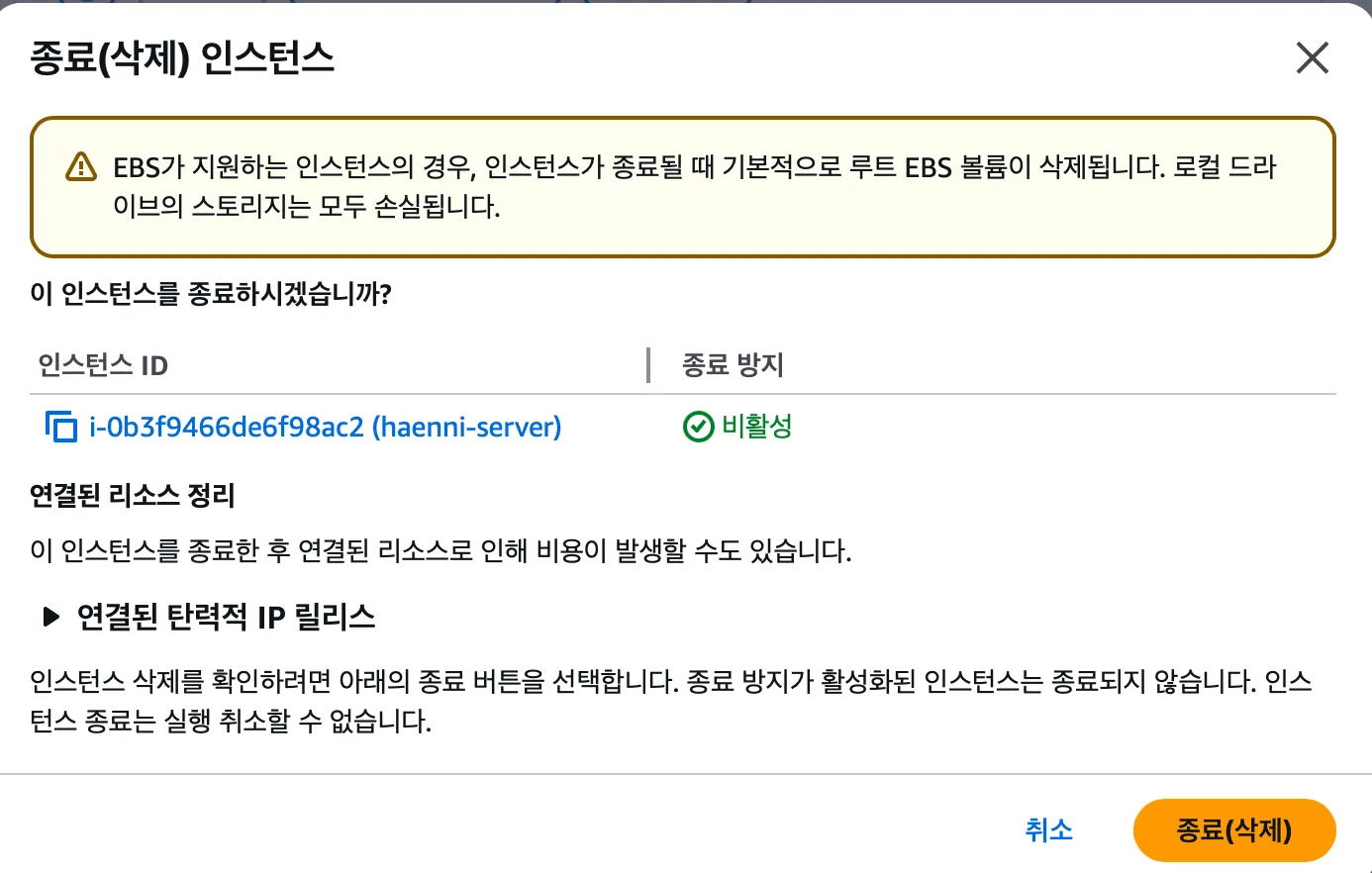 인스턴스를 종료한다. ’이 인스턴스를 종료한 후 연결된 리소스로 인해 비용이 발생할 수도 있습니다.’