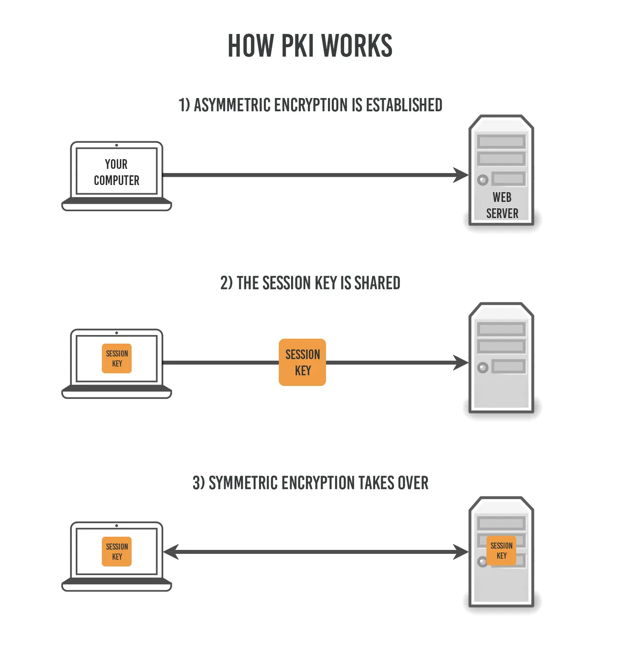 HTTPS 연결 과정에서 서버와 클라이언트 간에 세션키를 교환한다. 여기서 세션키는 주고 받는 데이터를 암호화하기 위해 사용되는 대칭키이며, 데이터 간의 교환에는 빠른 연산 속도가 필요하므로 세션키는 대칭키로 만들어진다.