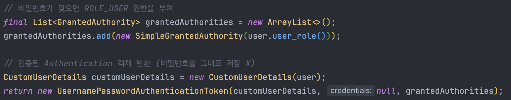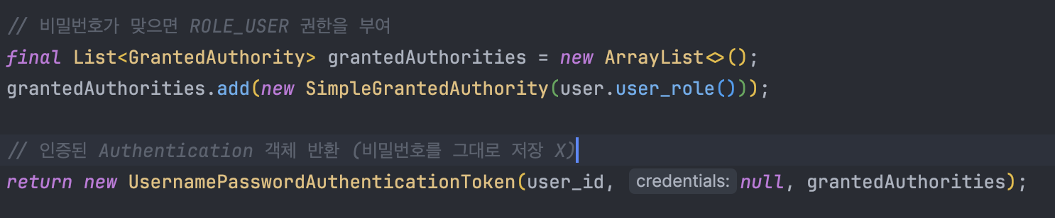 기존에 사용자 인증을 수행하던 AuthenticationProvider 클래스의 authenticate 메소드에서는 비밀번호 검증 후, 위와 같이 단순하게 user_id (String)로 Authentication 객체를 생성했습니다.