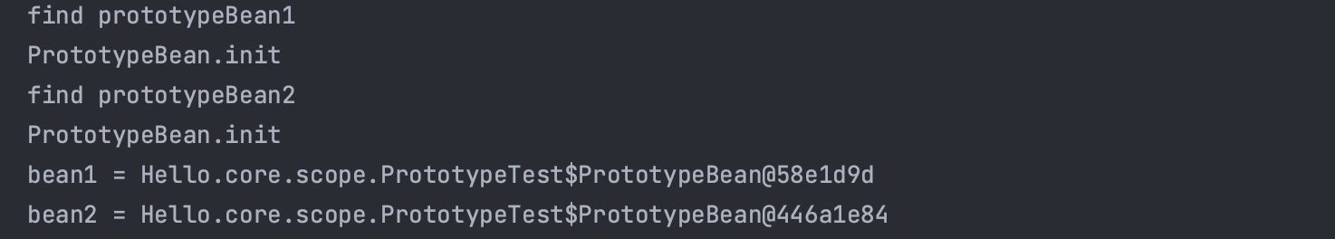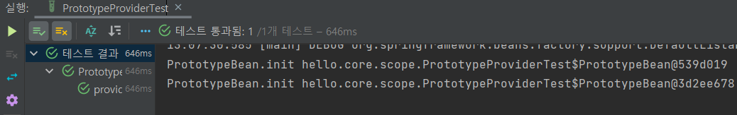 Test를 실행하면 정상적으로 다른 프토로타입 빈이 2개 생성된 것을 확인할 수 있다.