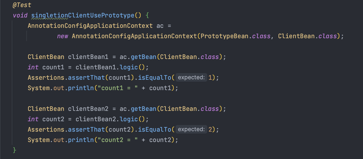 Assertions.assertThat(singletonBean1).isSameAs(singletonBean2);