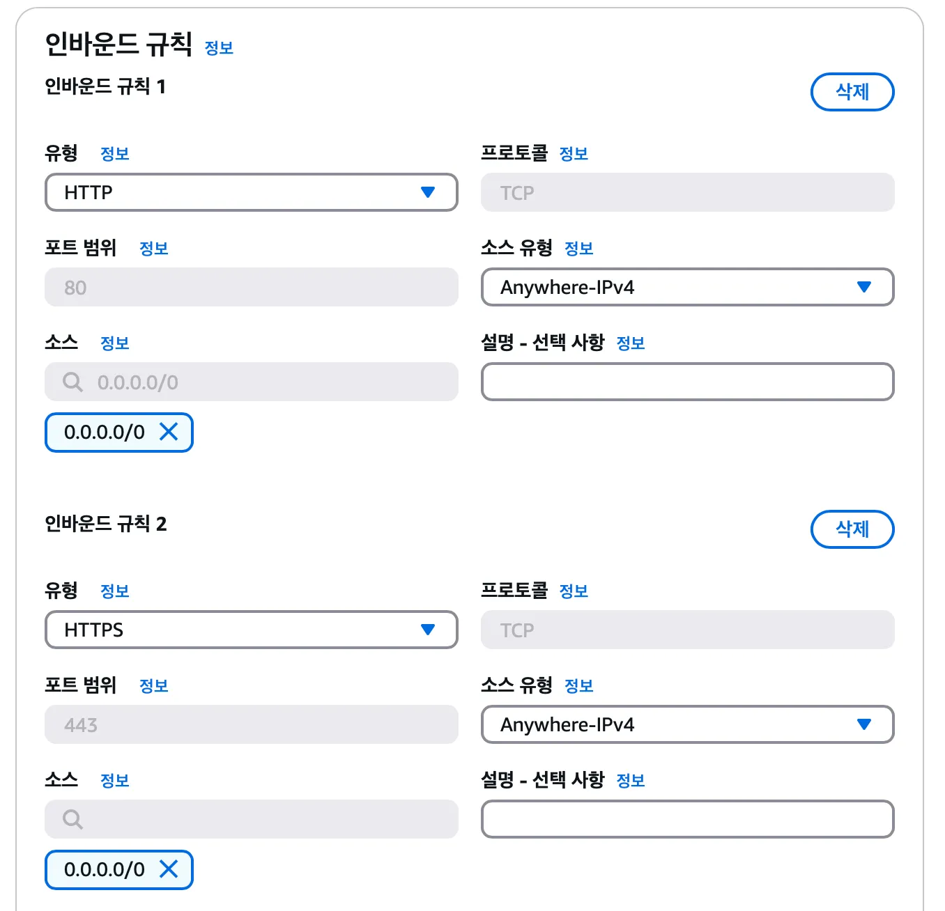보안 그룹 이름은 직관적이게 설정해주자. 설명을 입력하지않으면 넘어가지않으니 설명을 간단히 입력해주자.