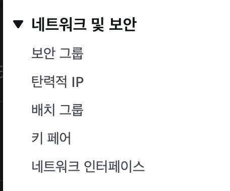 왼쪽 카테고리에 네트워크 및 보안을 클릭하여 보안 그룹을 들어가자.
