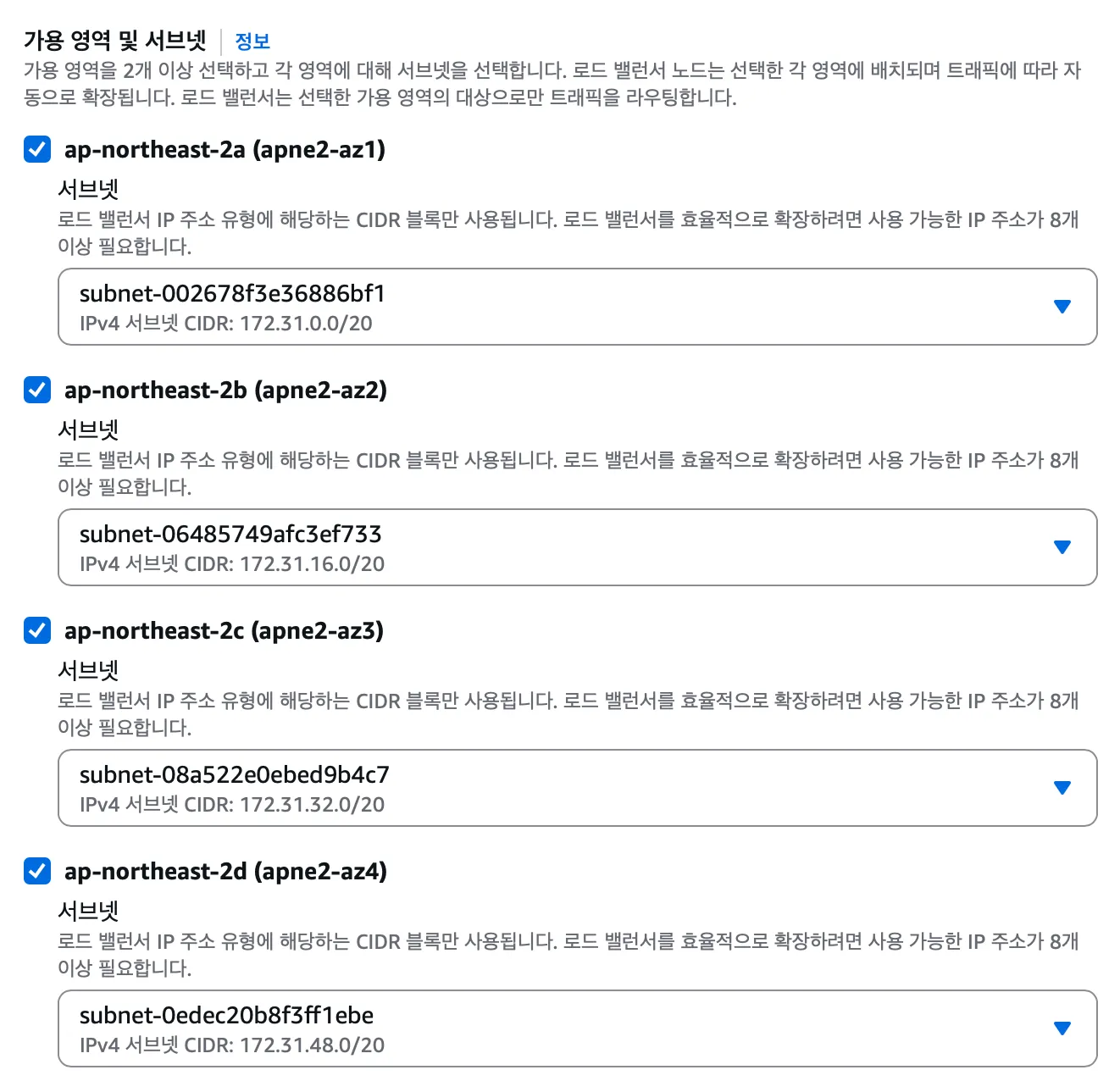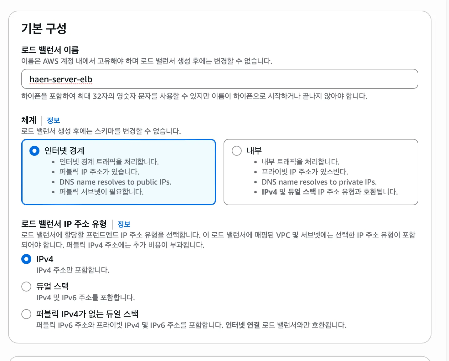 로드 밸런서 이름을 입력해주고 체계와 IP 주소 유형은 아래와 같이 구성한다.