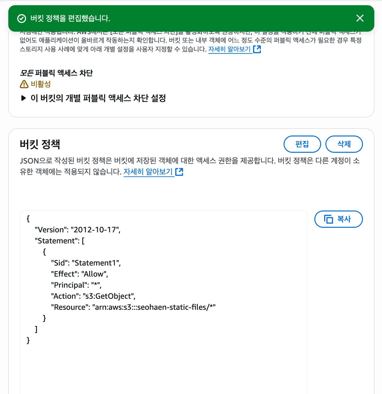 변경사항 저장을 눌러 버킷 정책 설정은 완료했다.