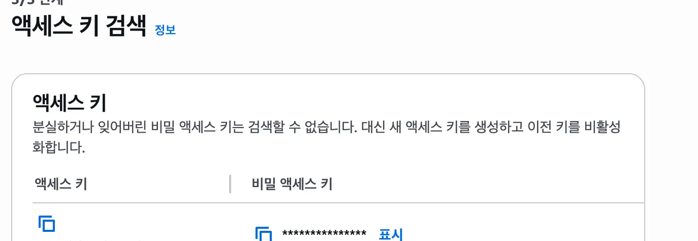 액세스 키 발급 완료 (현재 S3 삭제하여 노출되어도 괜찮다.)
