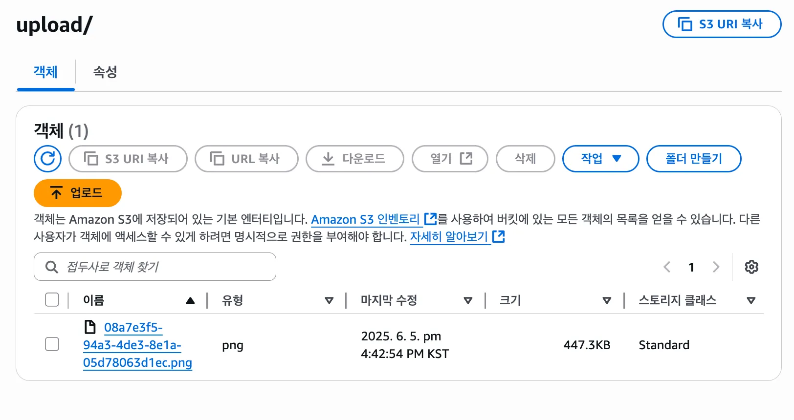 AWS S3에서도 이미지가 성공적으로 저장된 것을 확인할 수 있었다.