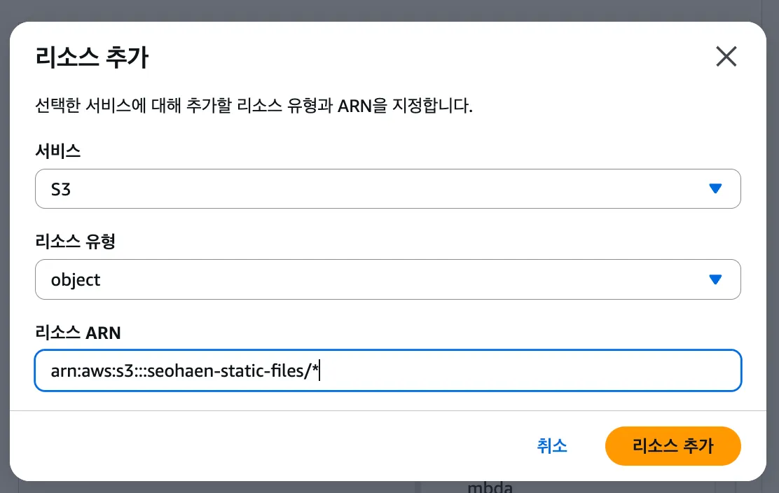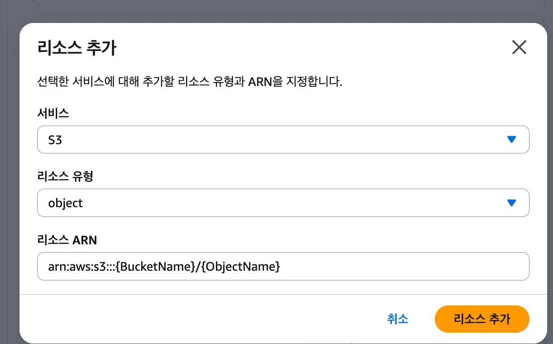 리소스 추가를 눌러서 리소스 유형을 ‘object’로 해주고, 리소스 ARN을 설정해주자.