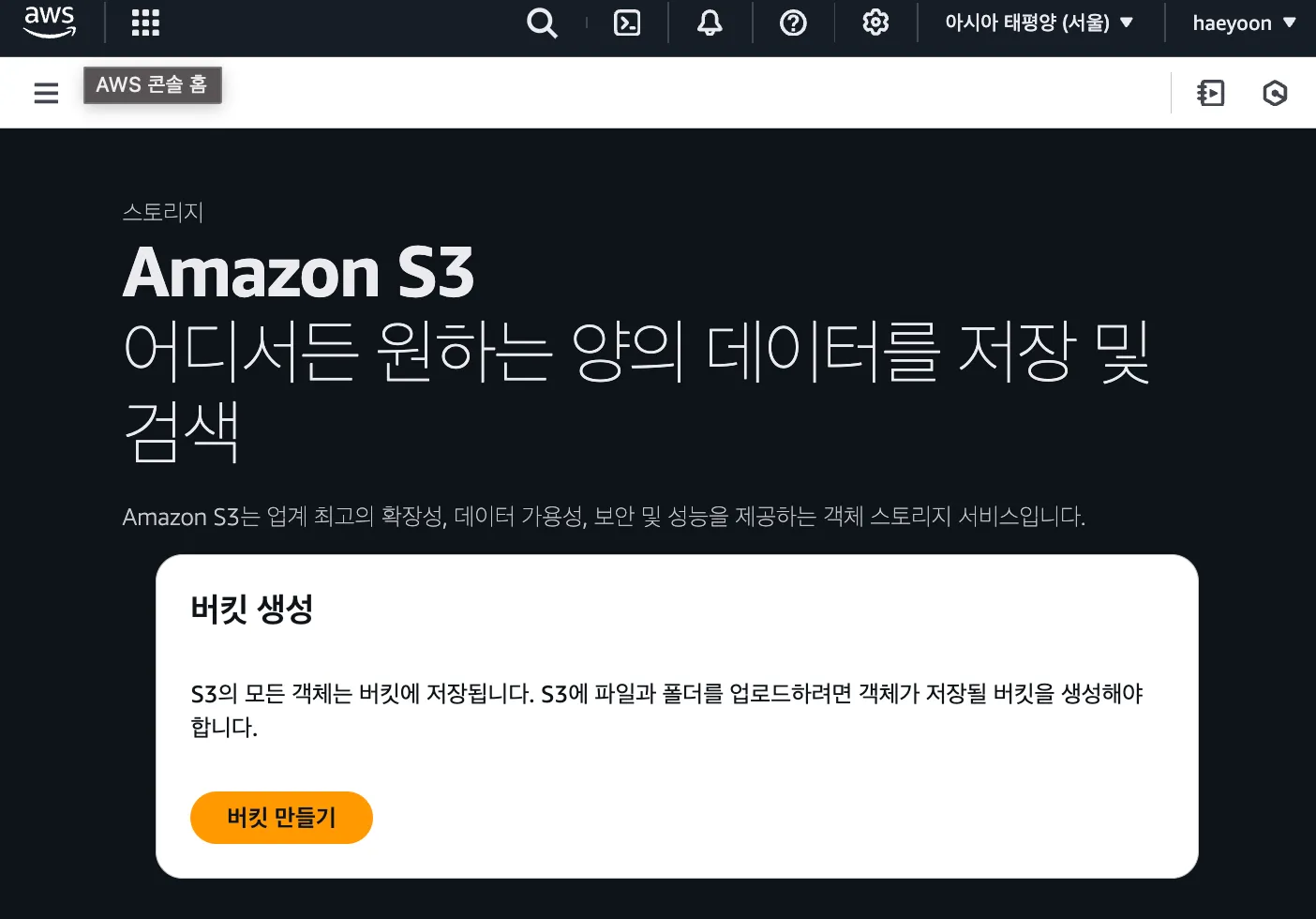 S3를 검색한 뒤, 버킷 만들기를 클릭하자
